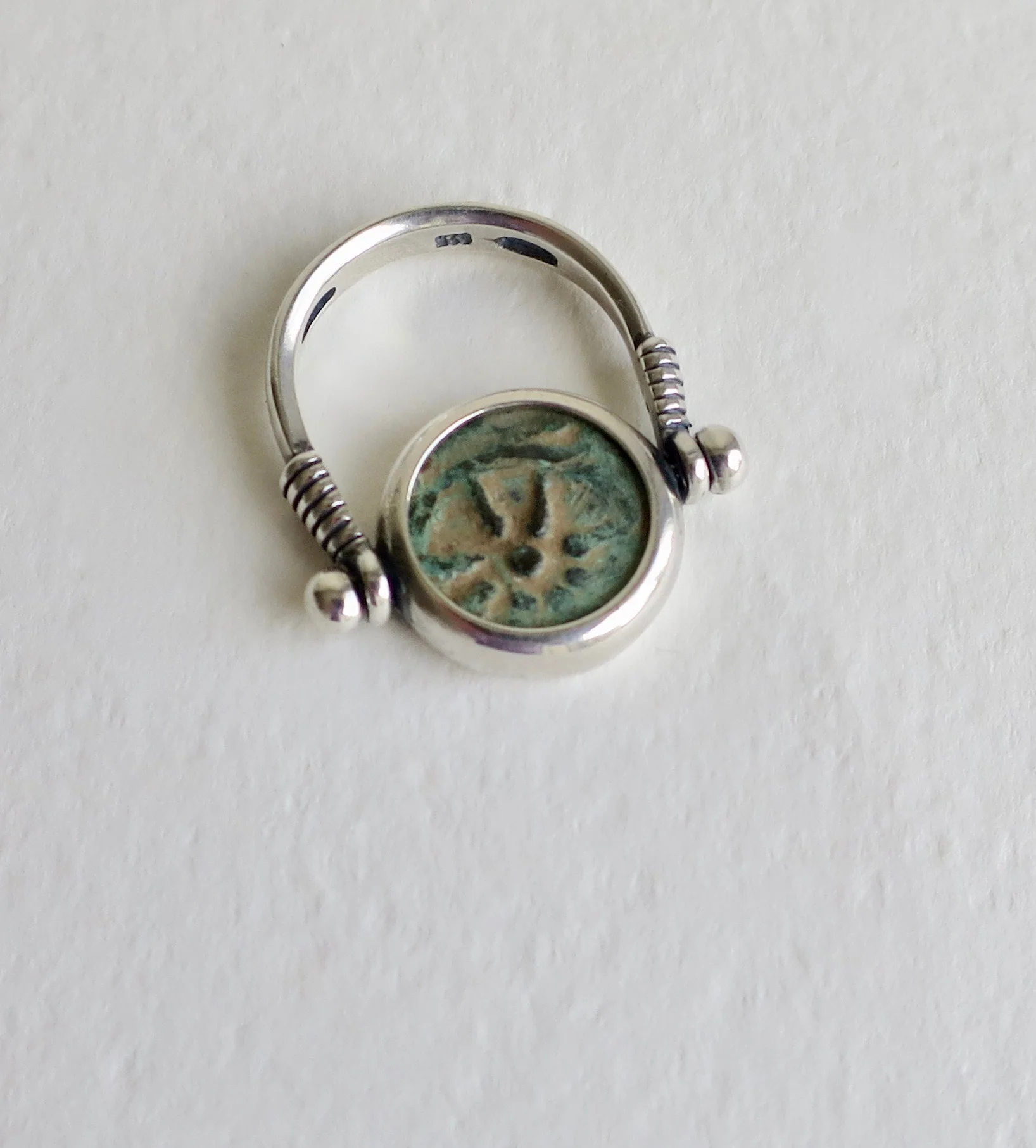 Ancient coins set in pendants, cufflinks, earrings and rings. Widow's mite bronze coin in swivel ring setting PreviousAlexander the Great drachm silver coin NextLily of Jerusalem coin set in silver ring Widow's mite bronze coin in swivel ring setting Widow's mite bronze coin in swivel ring setting $295.00 Widow’s mite bronze coin set in swivel silver ring. Ring size : 8.25. Certificate of Authenticity supplied. sold out Add To Cart Facebook0 Twitter LinkedIn0 Reddit Tumblr Pinterest0