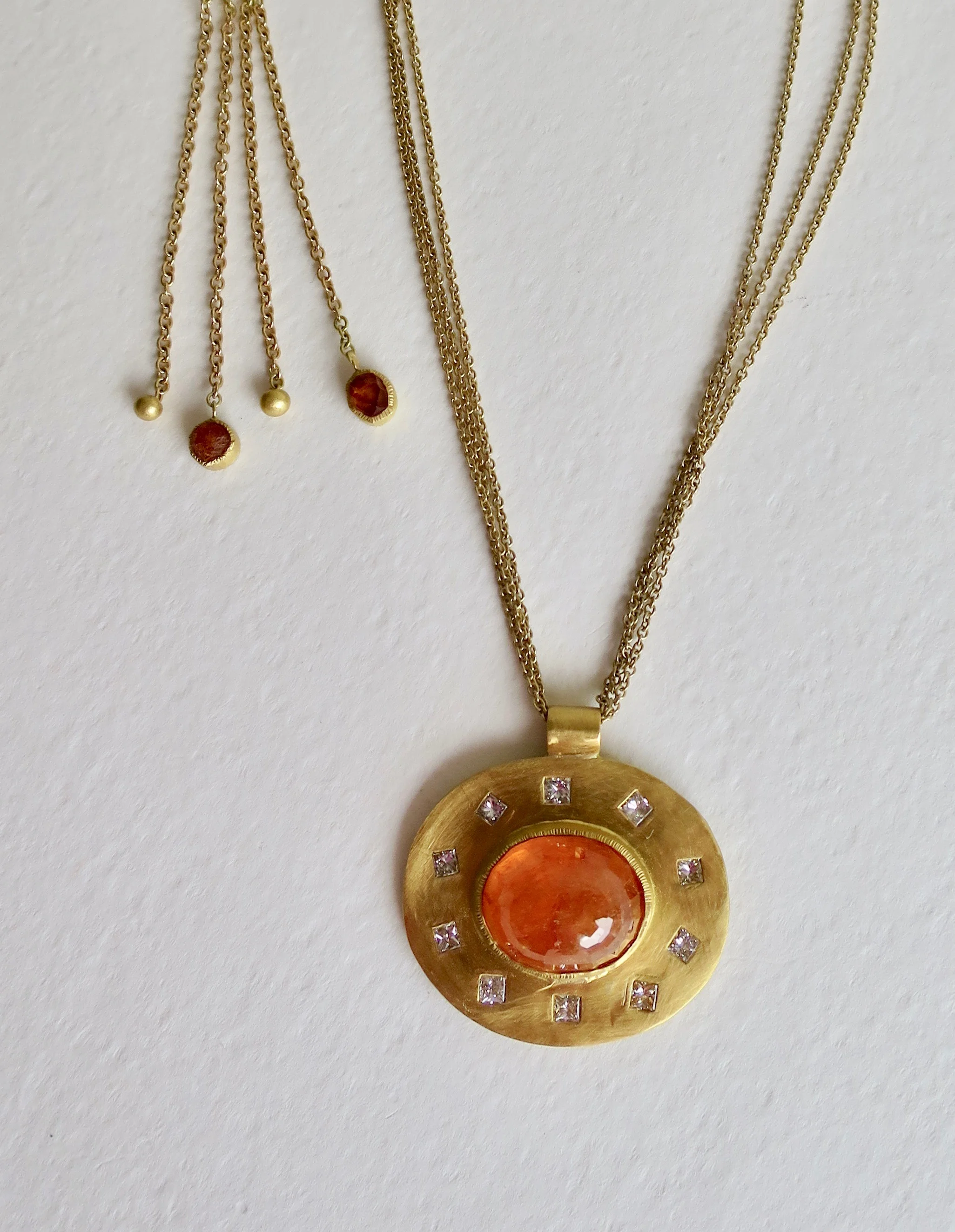 Mandarin Garnet set in 22kt gold, Princess diamonds surround, tripled 18kt gold chain with back drop of rough Mandarin garnets.
