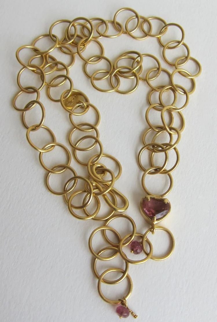 Jewels with silver and gold / unique designs using precious and semi precious stones. 18kt gold links neckpiece PreviousOceanic Kyanite neckpiece NextSpinel neckpiece with 22kt gold 18kt gold links neckpiece 18kt gold links neckpiece $4,650.00 18kt Gold links neckpiece with pink hand cut Tourmaline heart and drops. Length of necklace 18inches / 46cm. Add To Cart Facebook0 Twitter LinkedIn0 Reddit Tumblr Pinterest0