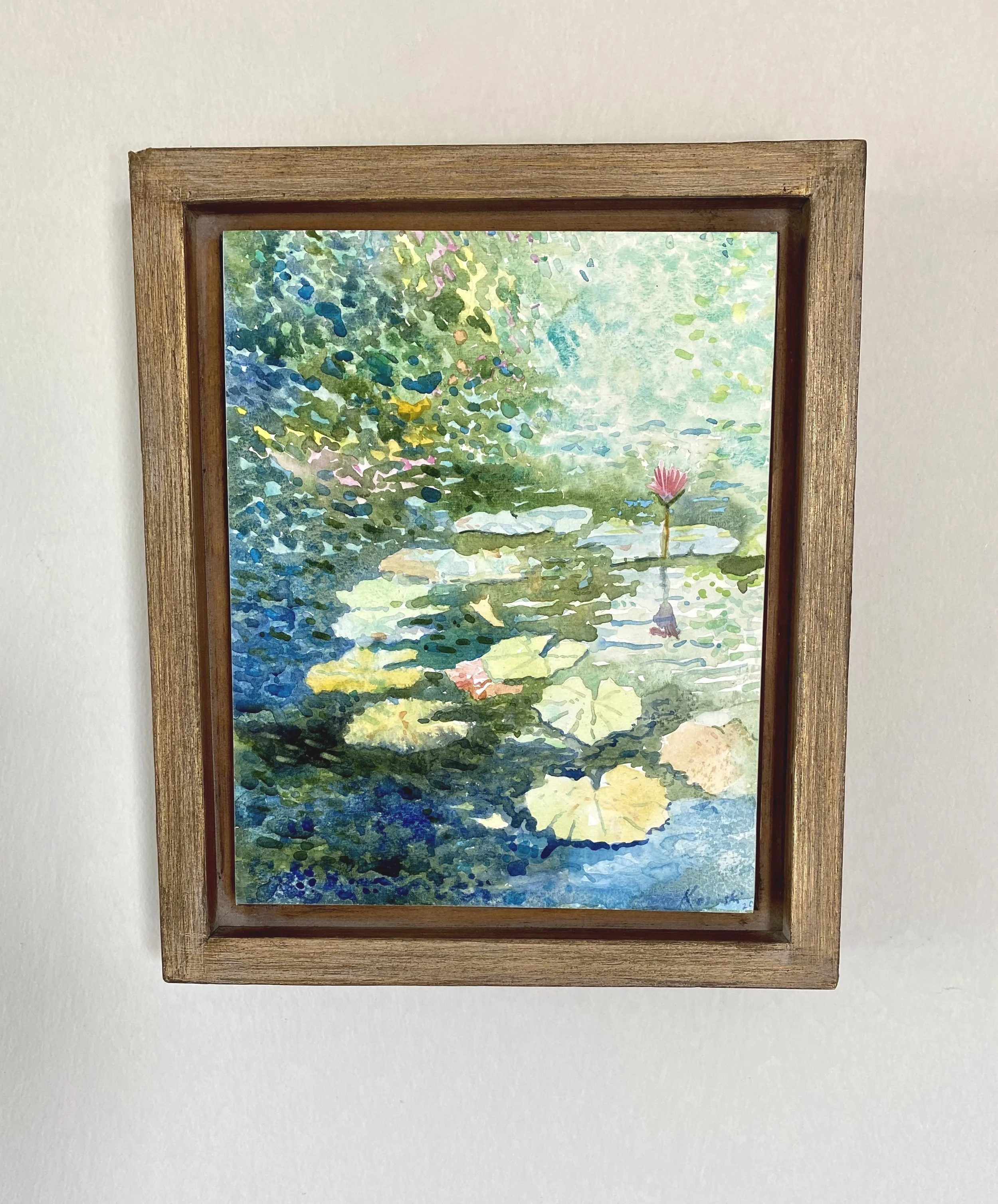 Original Watercolour painting of Waterlilies, with waxed finish for protection, in floating frame……..Image size 10 x 8 inches, with frame ……10 1/4 X 11 inches