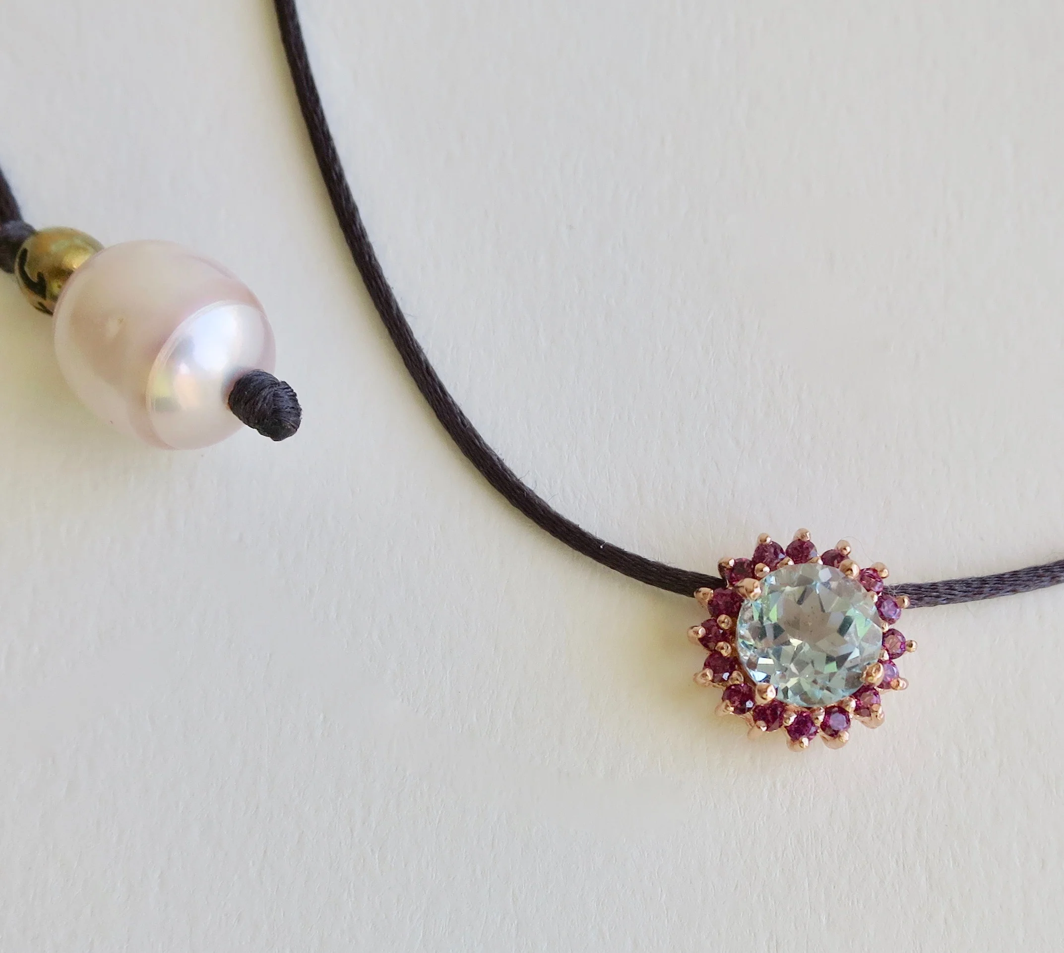 Pearls / unique creations of necklaces, earrings and bracelets / varieties of stones Choker neckpiece on Satin with Blue Topaz and Pink Sapphires PreviousLarge drop pearl with silver star set with diamonds NextBrown Agate / Black Onyx necklace Choker neckpiece on Satin with Blue Topaz and Pink Sapphires Choker neckpiece on Satin with Blue Topaz and Pink Sapphires $295.00 Adjustable choker with Blue Topaz, Pink Sapphires and Pink pearl backdrop Add To Cart Facebook0 Twitter LinkedIn0 Reddit Tumblr Pinterest0