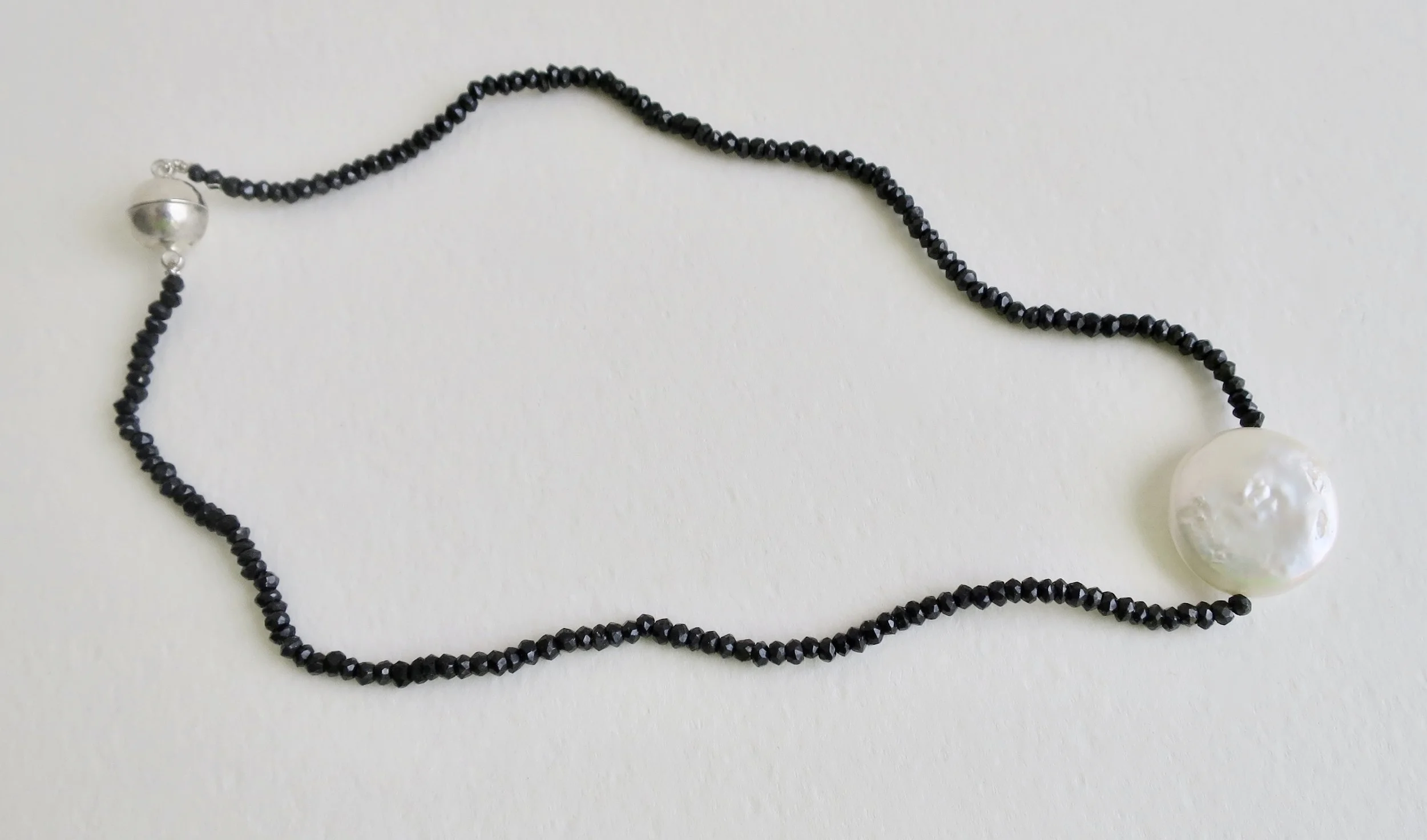 Pearls / unique creations of necklaces, earrings and bracelets / varieties of stones Flat pearl choker with Spinel PreviousLong knitted satin tie neckpiece with Pearls and Tourmaline NextBlack Onyx with Pyrite long necklace with Pearl and Onyx drop Flat pearl choker with Spinel Flat pearl choker with Spinel $180.00 Flat pearl choker with Spinel and silver magnetic clasp. Length of necklace is 15 inches / 38.1 cm. Add To Cart Facebook0 Twitter LinkedIn0 Reddit Tumblr Pinterest0