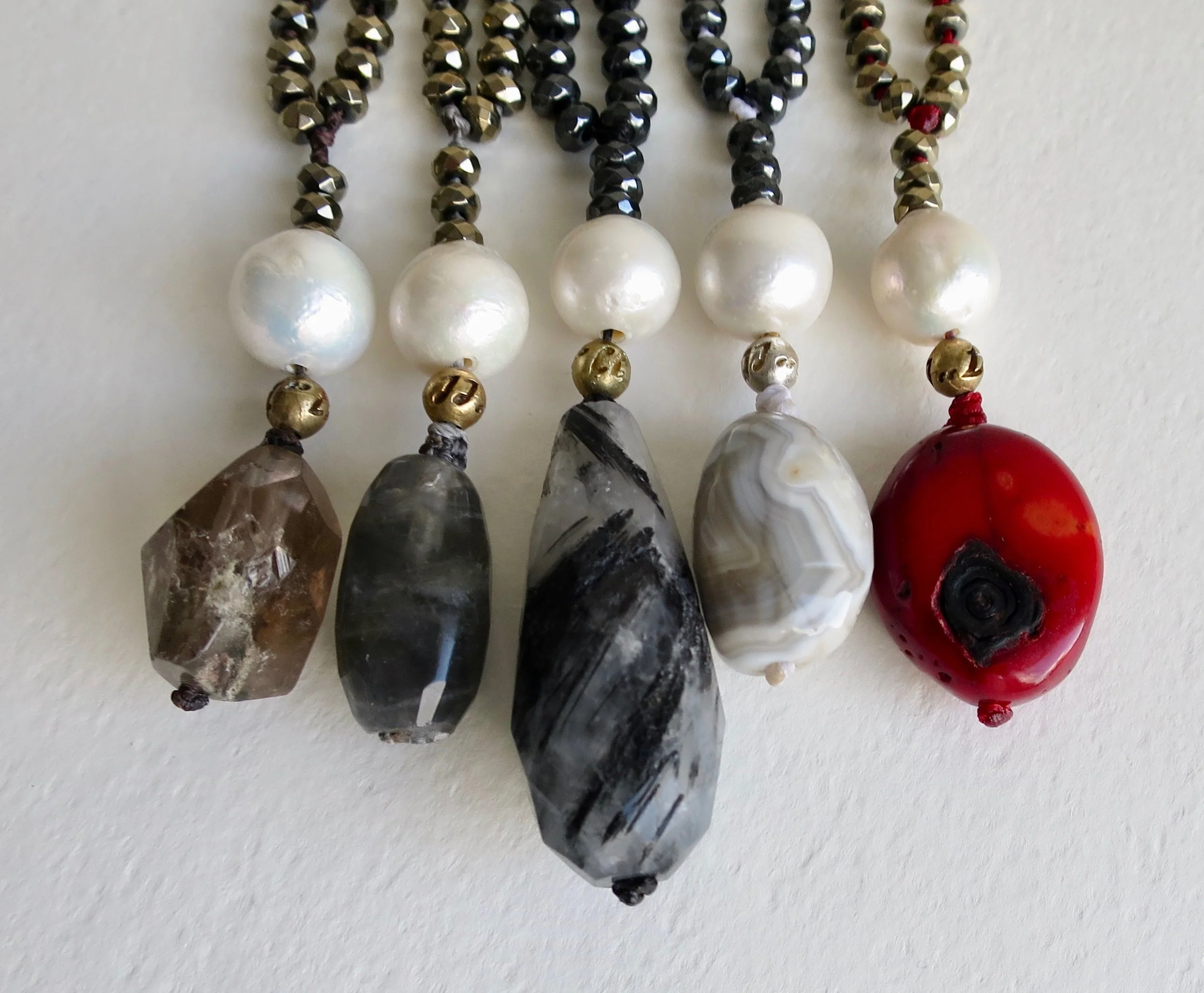 Pearls / unique creations of necklaces, earrings and bracelets / varieties of stones White Agate and Hematite Necklace PreviousBlue suede Pearl necklace NextCascade of Pearls on Blue Satin White Agate and Hematite Necklace White Agate and Hematite Necklace $260.00 White Agate and Hematite necklace with Large Agate and Pearl drop.Length of necklace 34inches / 86.3cm with 3inch / 7.5cm drop. Add To Cart Facebook0 Twitter LinkedIn0 Reddit Tumblr Pinterest0