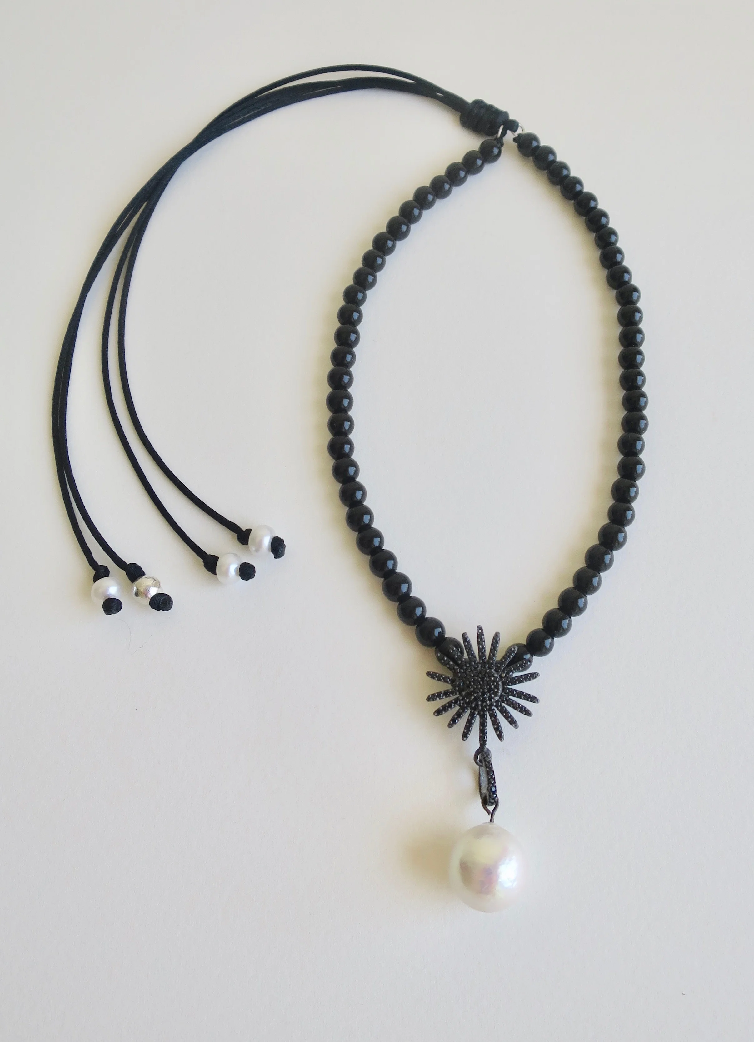 Black Onyx necklace / choker with black Spinel set in oxidised silver 'Sun' element with white drop Pearl. Adjustable length with pearl backdrops on satin.
