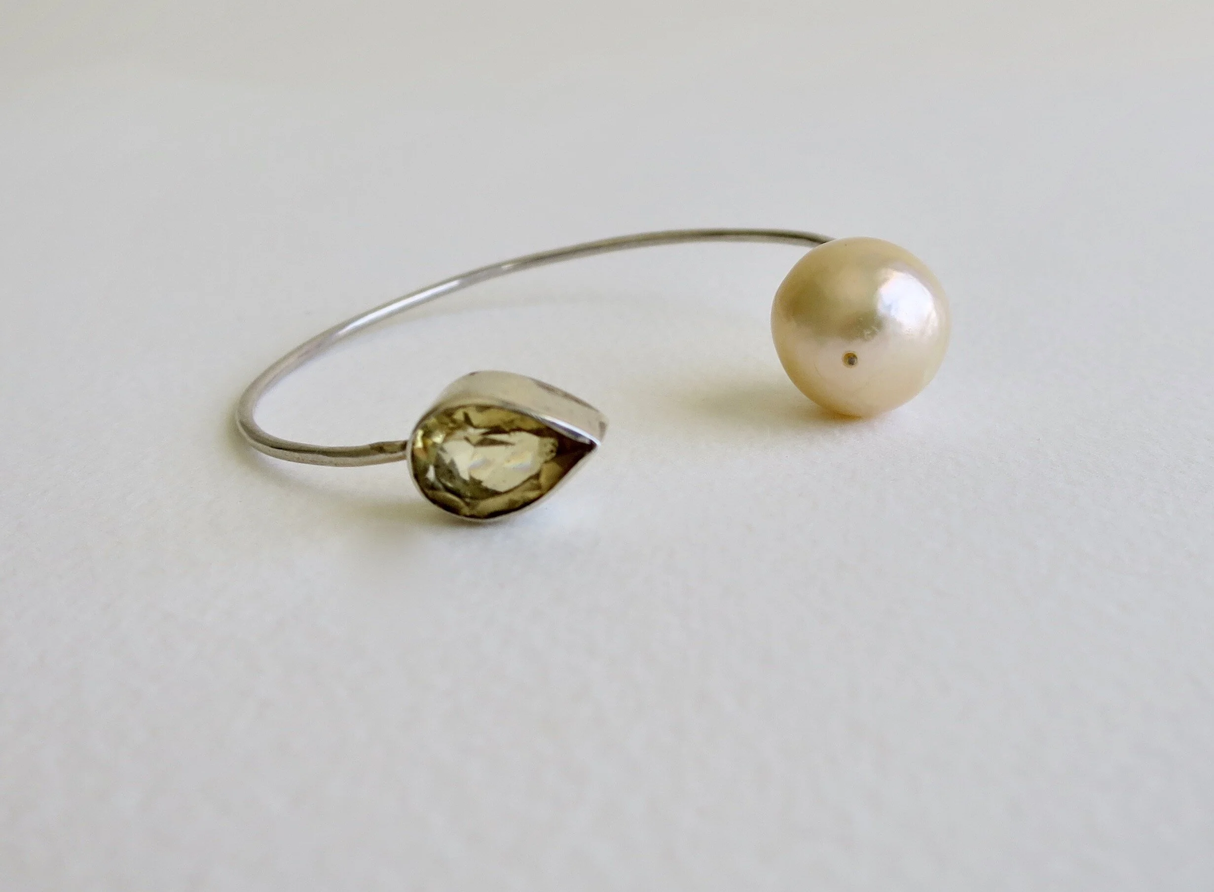 Pearls / unique creations of necklaces, earrings and bracelets / varieties of stones Silver open bangle with Pearl and pear shaped Citrine PreviousSilver bangle with Pearl and Amethyst NextSilver open bangle with Garnet and Pink Pearl Silver open bangle with Pearl and pear shaped Citrine Silver open bangle with Pearl and pear shaped Citrine $245.00 Silver open bangle with yellow tinged pearl and pear shaped Citrine set in silver. Add To Cart Facebook0 Twitter LinkedIn0 Reddit Tumblr