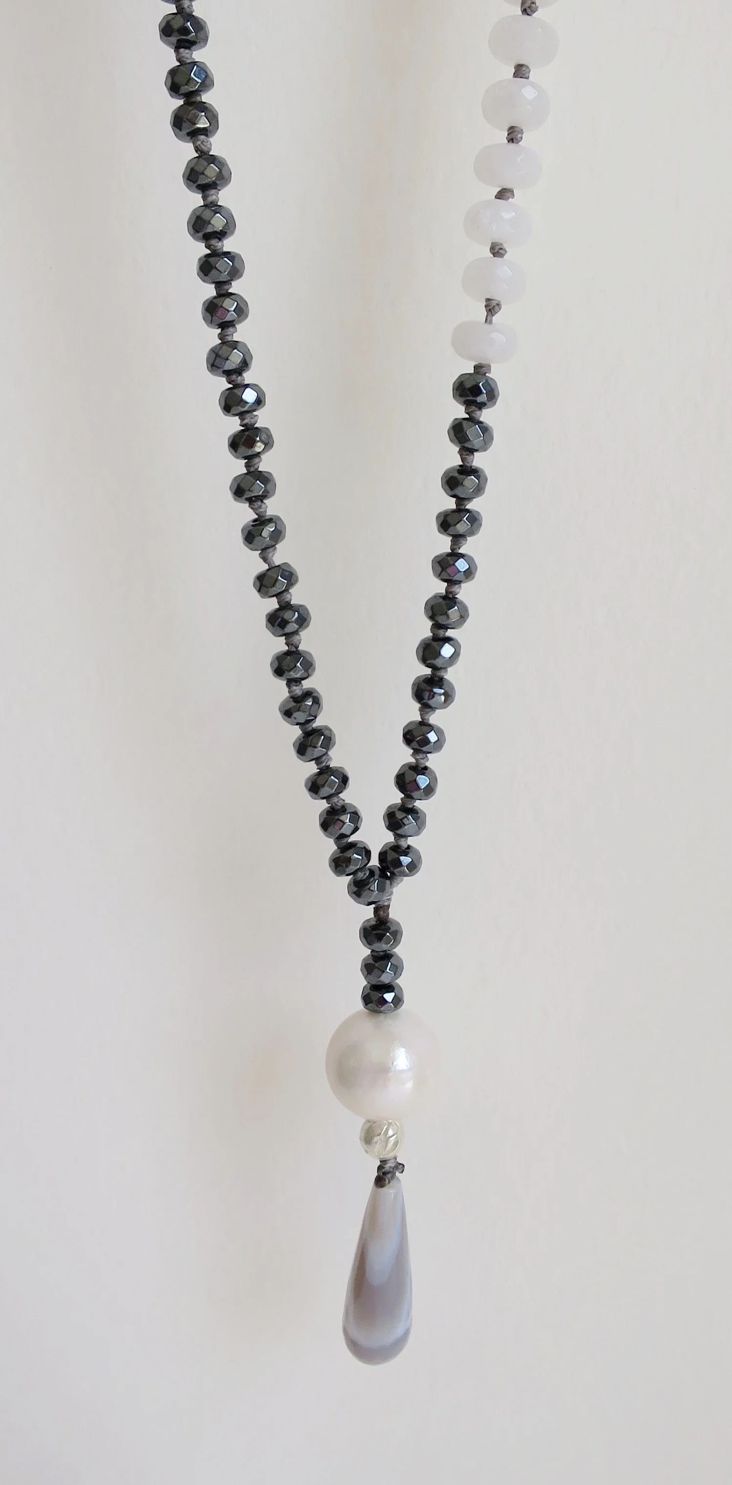 Pearls / unique creations of necklaces, earrings and bracelets / varieties of stones White Agate and Hematite necklace PreviousPurple Pearls Satin Necklace NextJade necklace with large pearl drop White Agate and Hematite necklace White Agate and Hematite necklace $260.00 White agate and Hematite necklace with Pearl and Agate drop. Length of necklace 33inches / 81.2cm with 3inch / 7.5cm drop. Add To Cart Facebook0 Twitter LinkedIn0 Reddit Tumblr Pinterest0